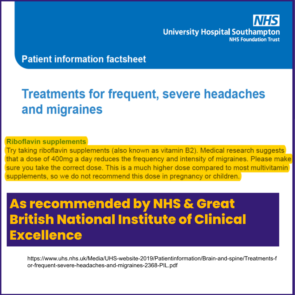 Recommended by NHS as it may be effective in reducing migraine frequency and intensity for some people (at this ultra high dose) e.g. hemiplegic, abdominal, cyclical, aura and vestibular. Scientific reports also suggest benefit to people with other neurological considerations Grand mal etc