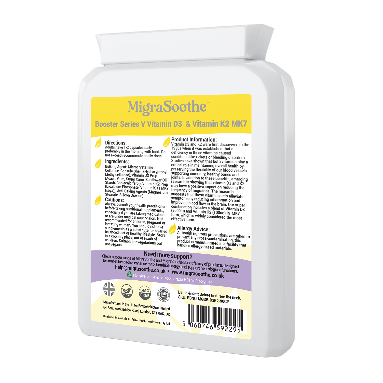 This supplement has been created to provide an optimum synergistic combination of Vitamin D3 3000 IU and Vitamin K2 100ug MK7 in one convenient daily capsule. Many experts believe that it's better to take vitamin D with vitamin K as they work synergistically. DOSE 1Cap- per day. Note: Not suitable for vegans.