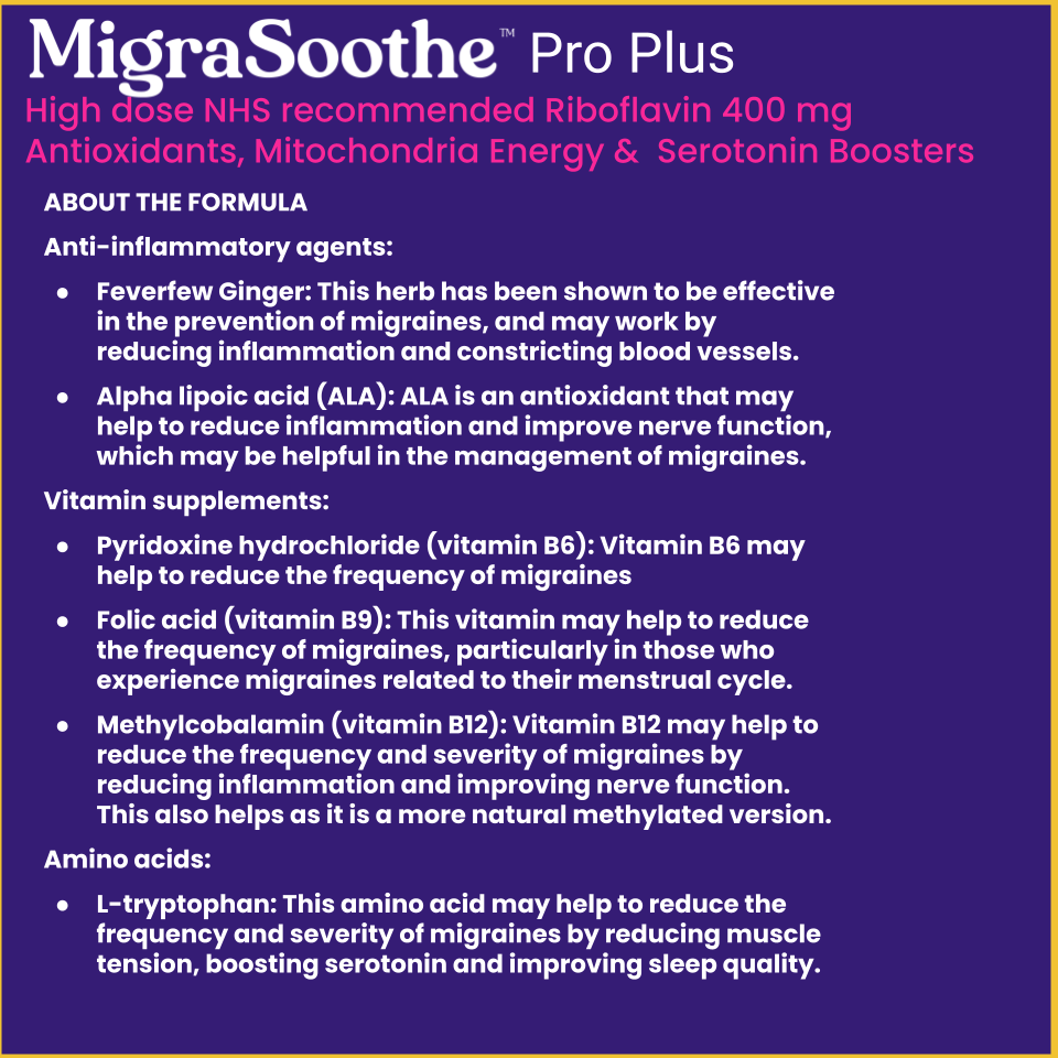 🧠MIGRASOOTHE-PRO PLUS is an enhanced version of MigraSooth Original. It contains Riboflavin (per dose) which is suggested by NHS as well as Premium addition L-TRYPTOPHAN (serotonin booster), ALPHA LIPOIC ACID a (powerful antioxidant) Vitamins B6, Folic and Methyl B12 (Nervous system support and methylation), FEVERFEW GINGER (Traditional European and far Eastern remedies for headache).